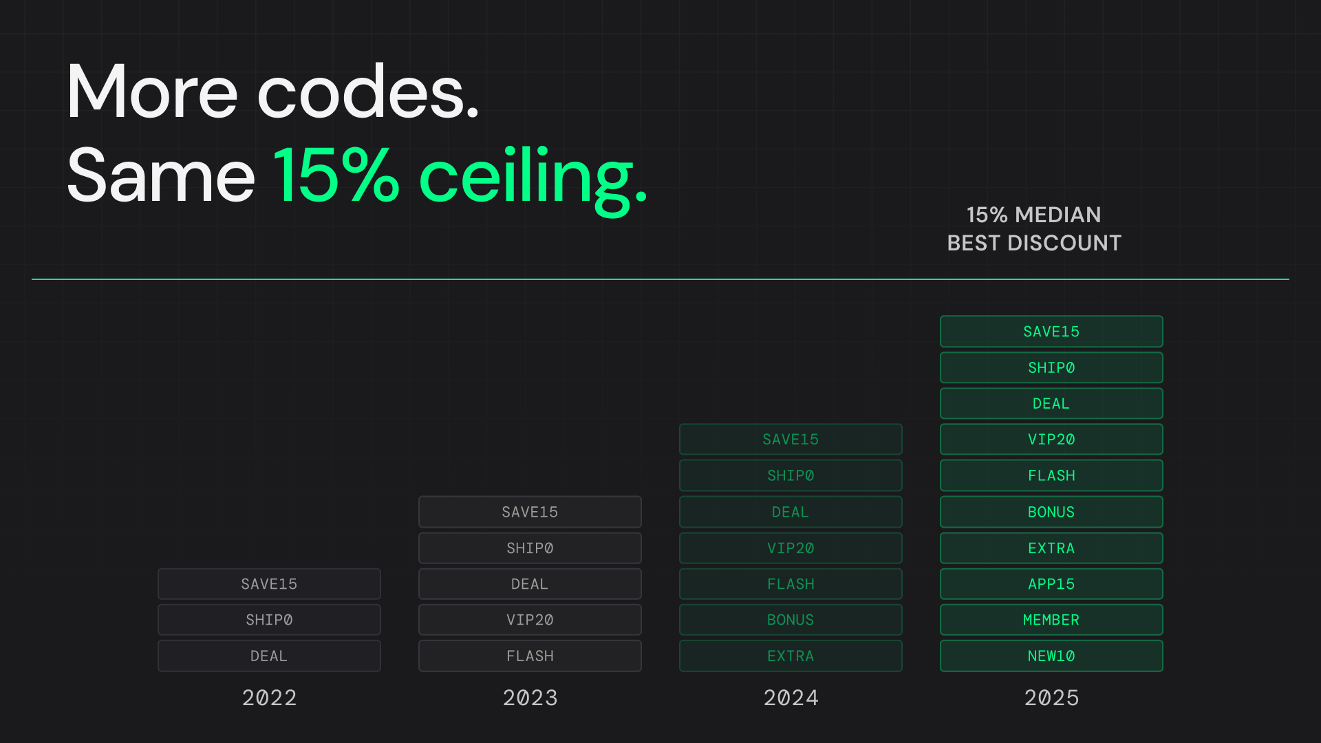 The median best discount has remained frozen at 15% off since 2022 — four straight years.